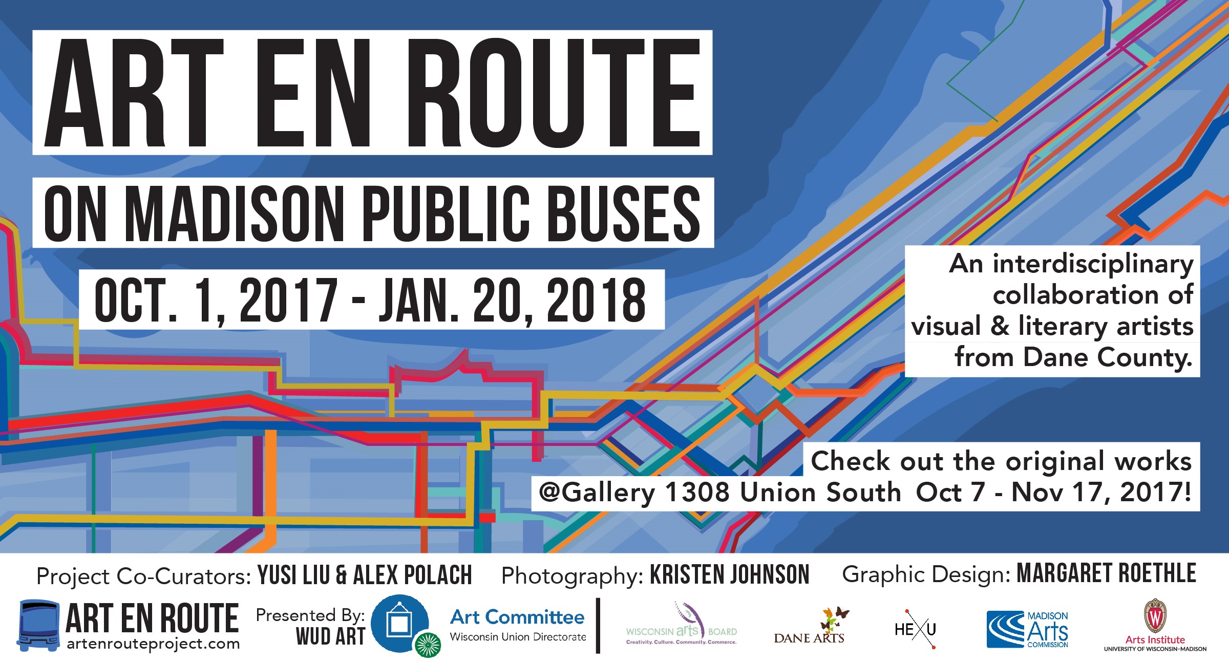 The Wisconsin Union Directorate (WUD) Art Committee’s “Art En Route” art project debut on Oct. 1 with eight pieces of art displayed on eight Madison Transit buses until Jan. 1, 2018, and will celebrate the project’s debut at an opening reception Oct 7 at 2 p.m. in Gallery 1308 at Union South.