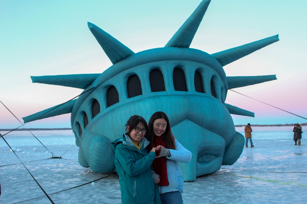 The Wisconsin Union team brings out a to-scale, inflatable replica of the Statue of Liberty’s head, arm and torch to frozen Lake Mendota each year during Winter Carnival. This year’s appearance will occur on land at Library Mall and will include the Statue’s head. More information about the Statue’s history of Madison appearances can be found here.