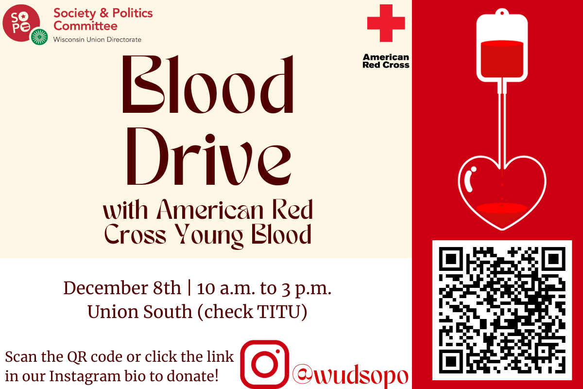 Did you know that hospitals are facing a blood shortage? To meet the needs of healthcare facilities looking for blood, SoPo and American Red Cross Young Blood are teaming up to host a blood drive! Come to Union South on December 8th from 10 a.m. to 3 p.m. to donate. To sign up to donate, please visit https://www.redcrossblood.org/give.html/drive-results?zipSponsor=Badgers. If you can't donate but would like to volunteer, please email societyandpolitics@union.wisc.edu.