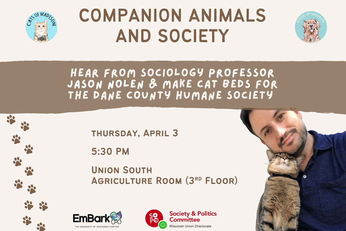 Join WUD Society & Politics and EmBark as we hear from sociology faculty member and the face behind the Instagram-famous Cats of Madison and Dogs of Madison, Dr. Jason Nolen! While Dr. Nolen discusses the history and societal impacts of companion animals, we’ll also be making fleece cat beds to donate to the Dane County Humane Society. This event explores the deep bond between humans and animals, examining how pets shape our lives, communities, and even social structures. Whether you're an animal lover, sociology enthusiast, or just looking for a fun and meaningful way to give back, this event offers a unique opportunity to learn, engage, and support local shelter animals. All materials will be provided!