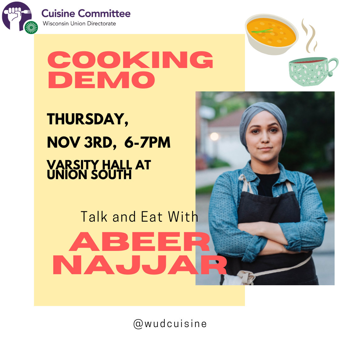 This Thursday, November 3rd, 2022, from 6-7 pm in Union south -Varsity Hall, Abeer Najjar is coming for the Cooking demo!