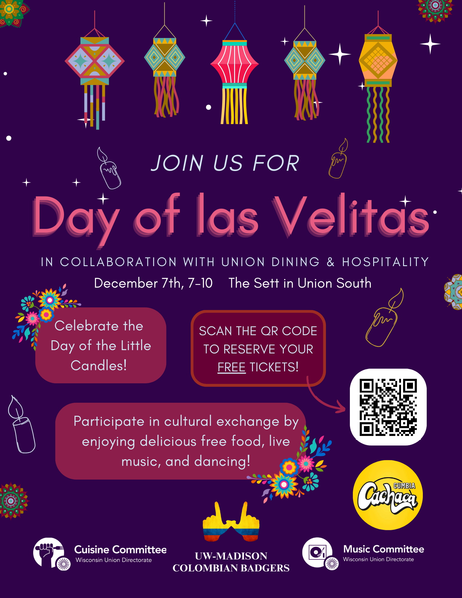 Join WUD Cuisine, WUD Music, UW Colombian Badgers, and Wisconsin Union Dining/Hospitality for a celebration of the day of las velitas. A celebration of light complete with food, music, dancing, and crafts!