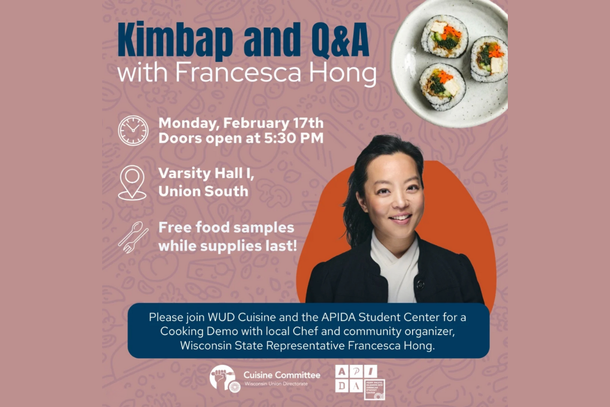 Join WUD Cuisine and APIDASC for a live cooking demonstration with State Representative Francesca Hong, chef, entrepreneur, and Wisconsin State Representative. Watch as she prepares delicious vegan kimbap, sharing her culinary expertise and cultural insights along the way. Enjoy free samples while supplies last, and don’t miss the chance to ask questions during the live Q&A.