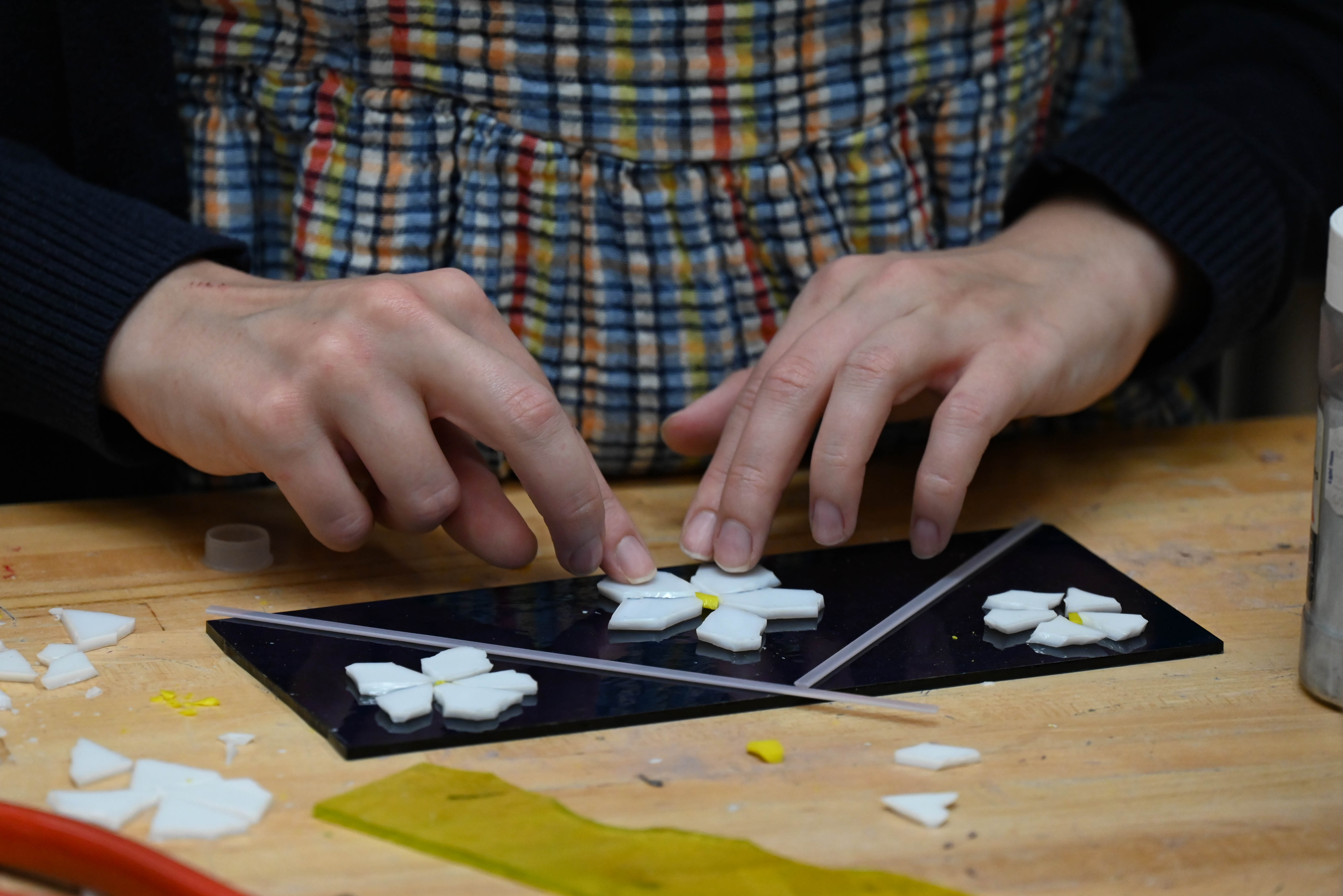 Learn basic glass cutting and fusing techniques to create an architectural wave panel that stands up on its own. You'll be able to display your beautiful creation on a bookshelf or table in your home. All supplies for this course are provided and all skill levels are welcome.