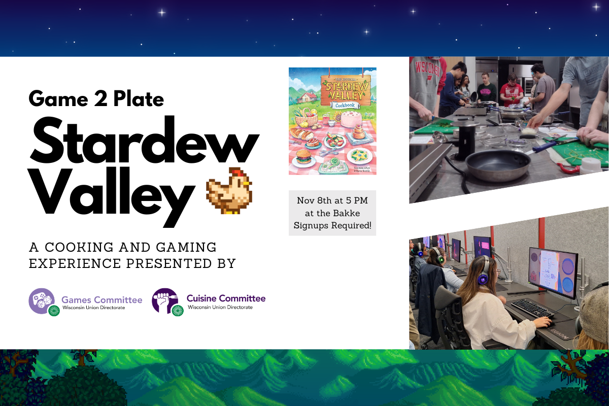 Join WUD Games and WUD Cuisine for a cooking and gaming experience featuring the popular game, Stardew Valley! Participants will have the chance to play the video game Stardew Valley and cook dishes from the official Stardew Valley cookbook in a mini cooking workshop. The event will kickoff in the Bakke kitchens and start exactly at 5pm.