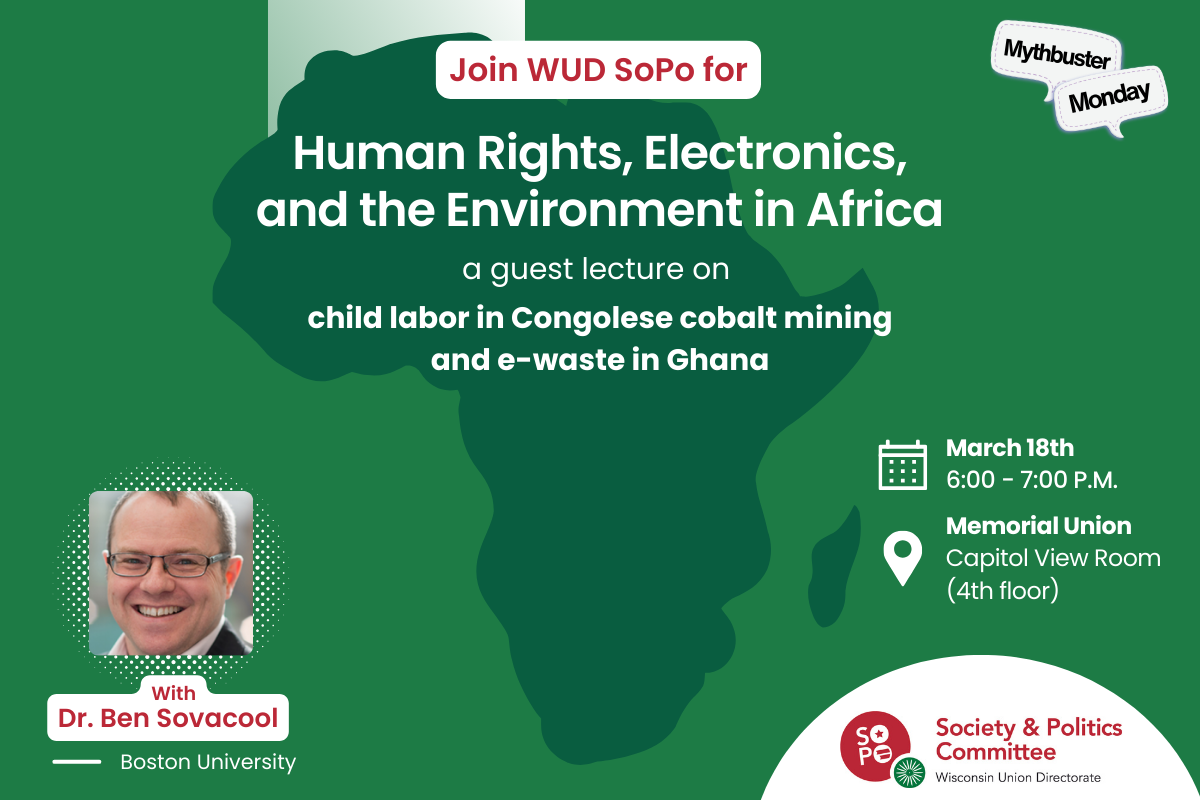 Join WUD SoPo for a Mythbuster Monday guest lecture, where we will explore the human rights implications of cobalt mining in the Democratic Republic of the Congo and how electronic waste affects the Ghanaian environment. We'll be joined by expert Dr. Ben Sovacool from Boston University for this special event on March 18th at Memorial Union in the Capitol View Room (4th floor) from 6 to 7 p.m.