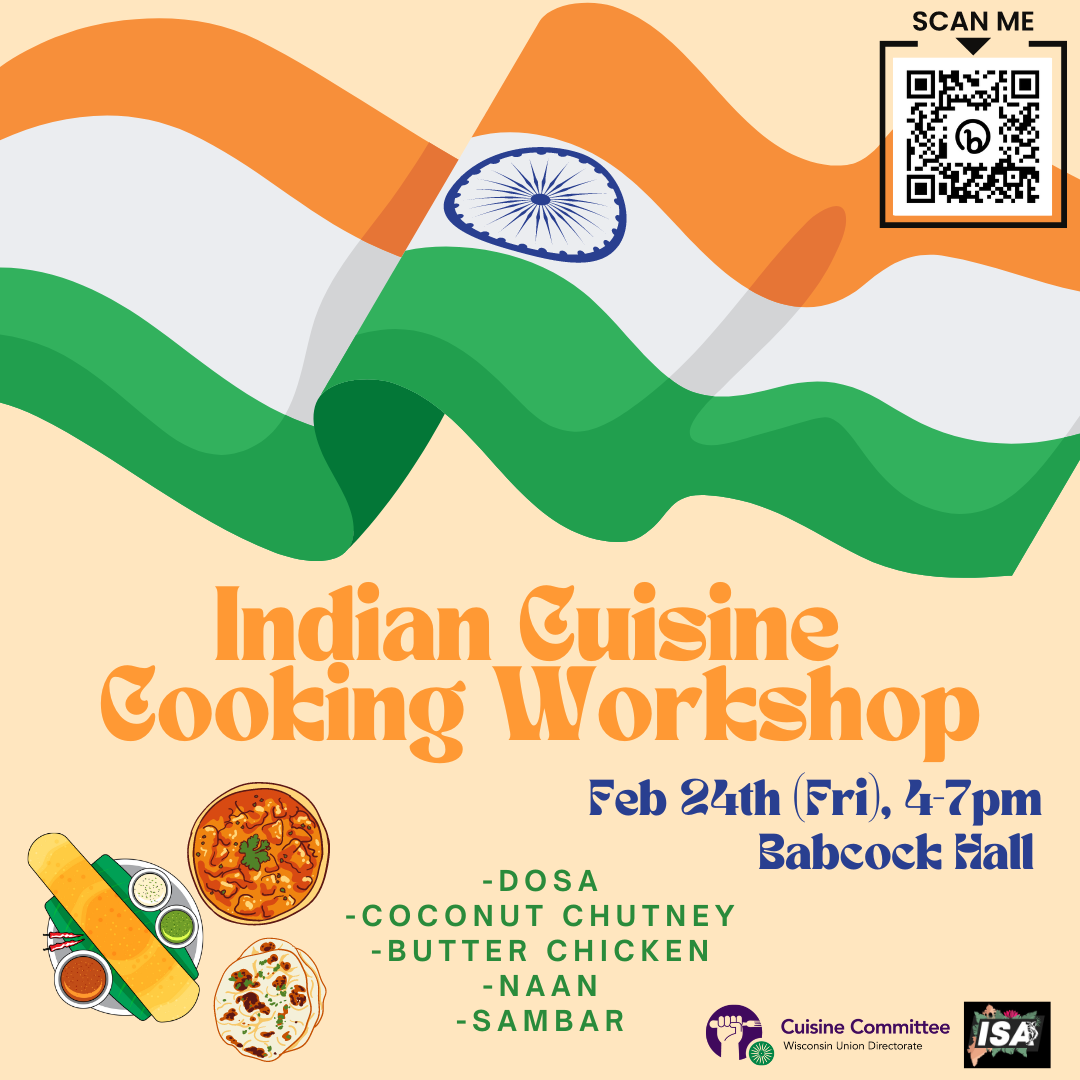 Let's make 5 different Indian foods with WUD Cuisine! We will make Masala dosa, Butter chicken, Coconut chutney, Naan, and Sambar. Presented by: WUD Cuisine cuisine@union.wisc.edu
