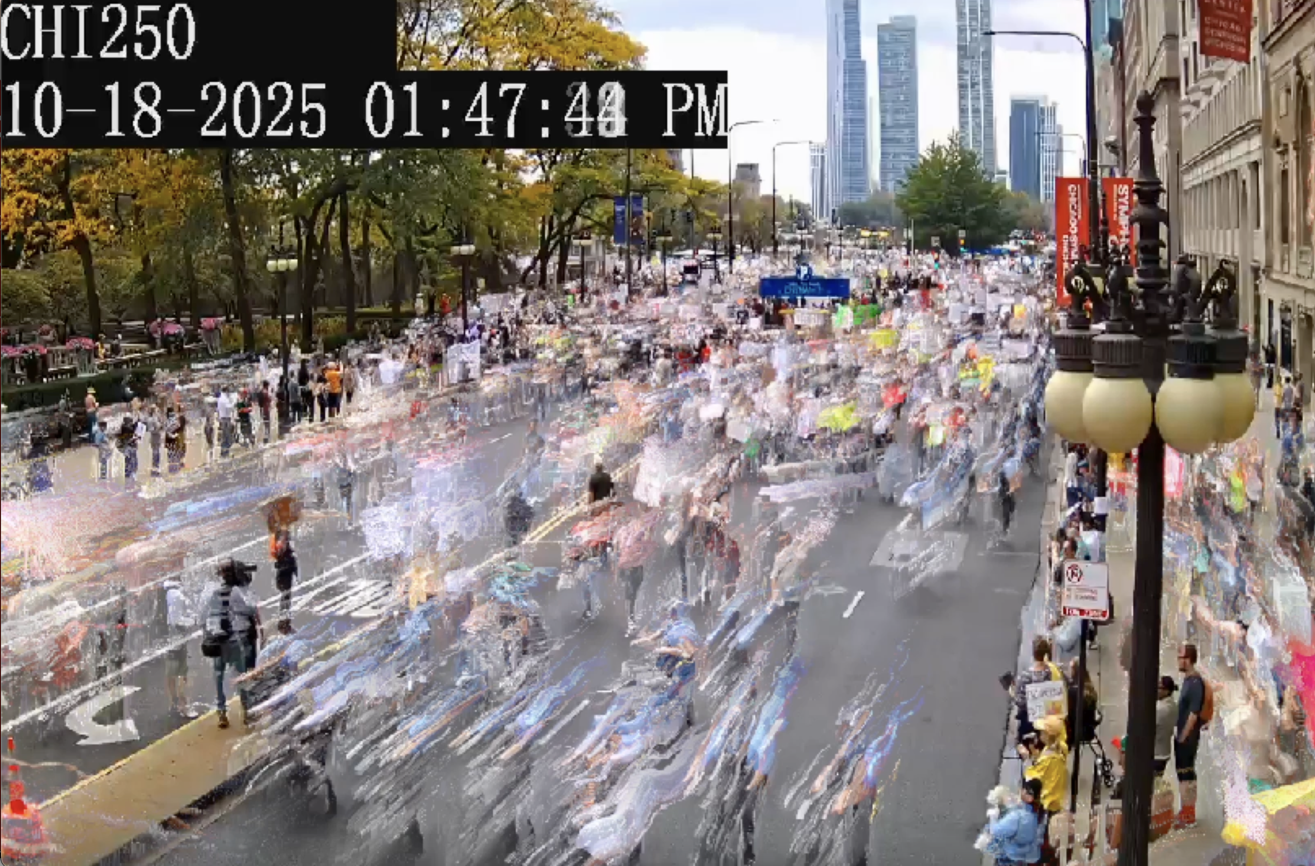 In the multi-channel installation, Stoner pairs surveillance video of political events that have occurred in Midwest cities such as Chicago and Minneapolis during the past year with data sonification from that footage. She uses the pixel movements of people in the video to create audio that illustrates the volume and intensity of motion. The exhibition also incorporates the voices of people who have been injured during protests in the United States. Stoner uses directional speakers to spatially isolate the sound in the exhibition, offering visitors various experiences as they explore each area of the gallery.
