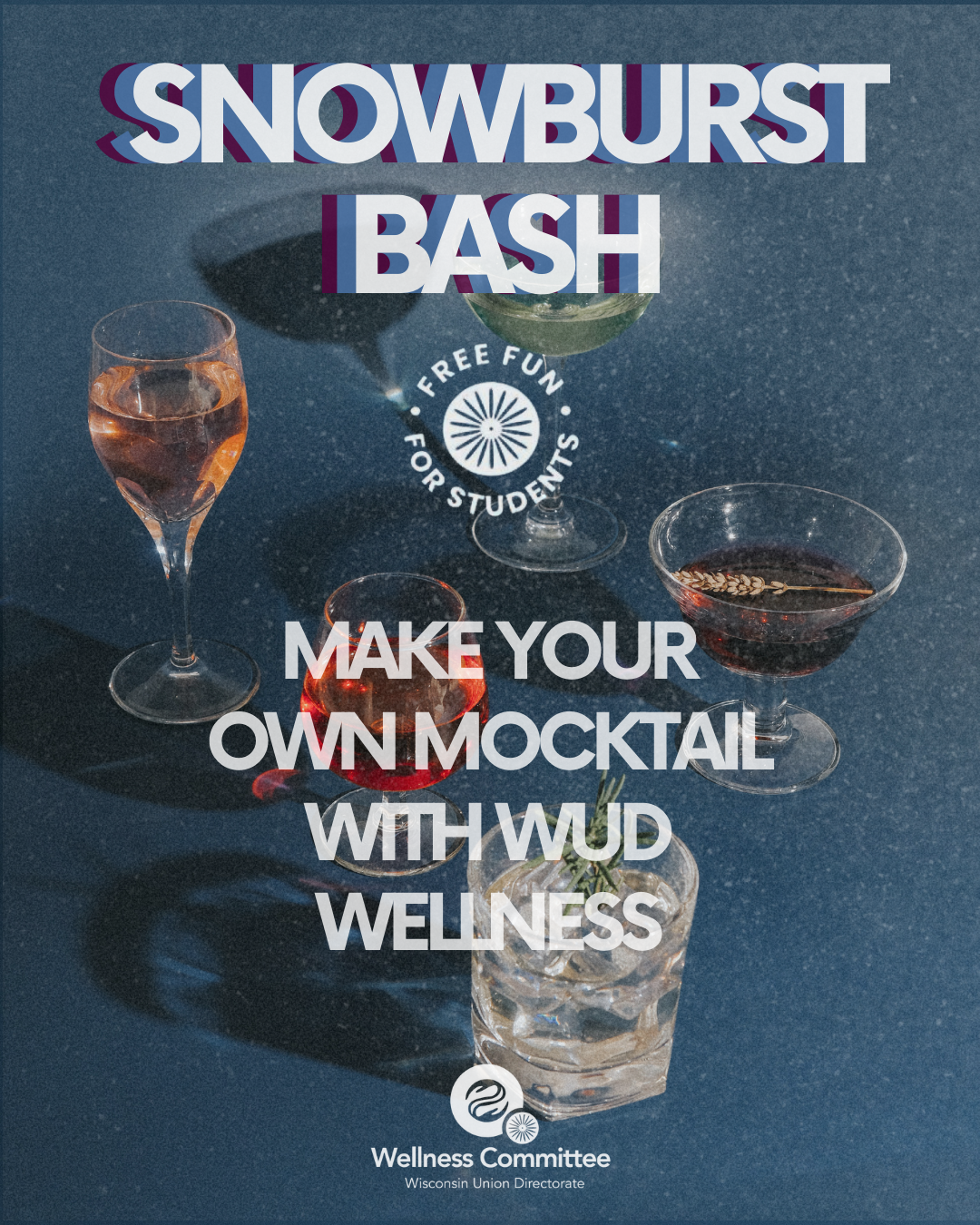 Find us in The Well at Union South during the Snowburst Bash to make your own mocktails. Mix and match ingredients to make your very own signature drink! Presented by: WUD Wellness