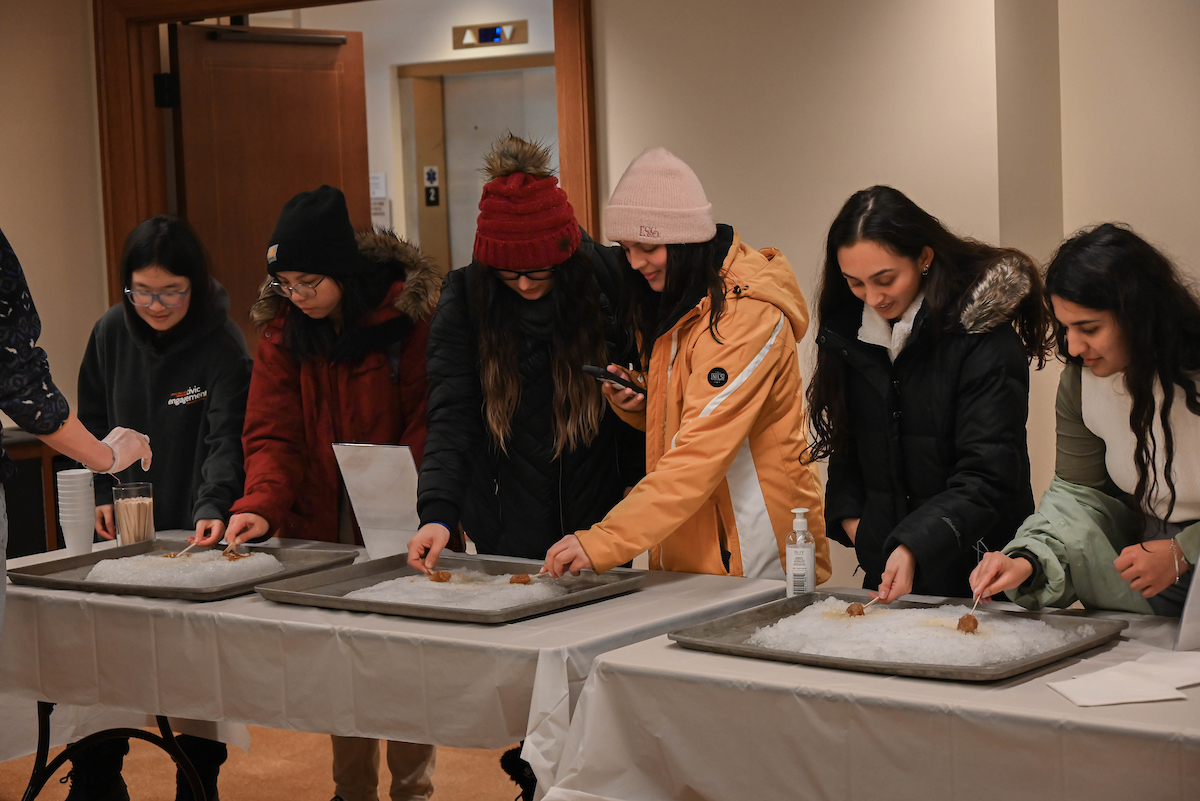 Canadian maple candy is a staple in winter months made by pouring boiling maple syrup past the point where it would form maple syrup on a bed of clean snow and rolling it up on a stick.