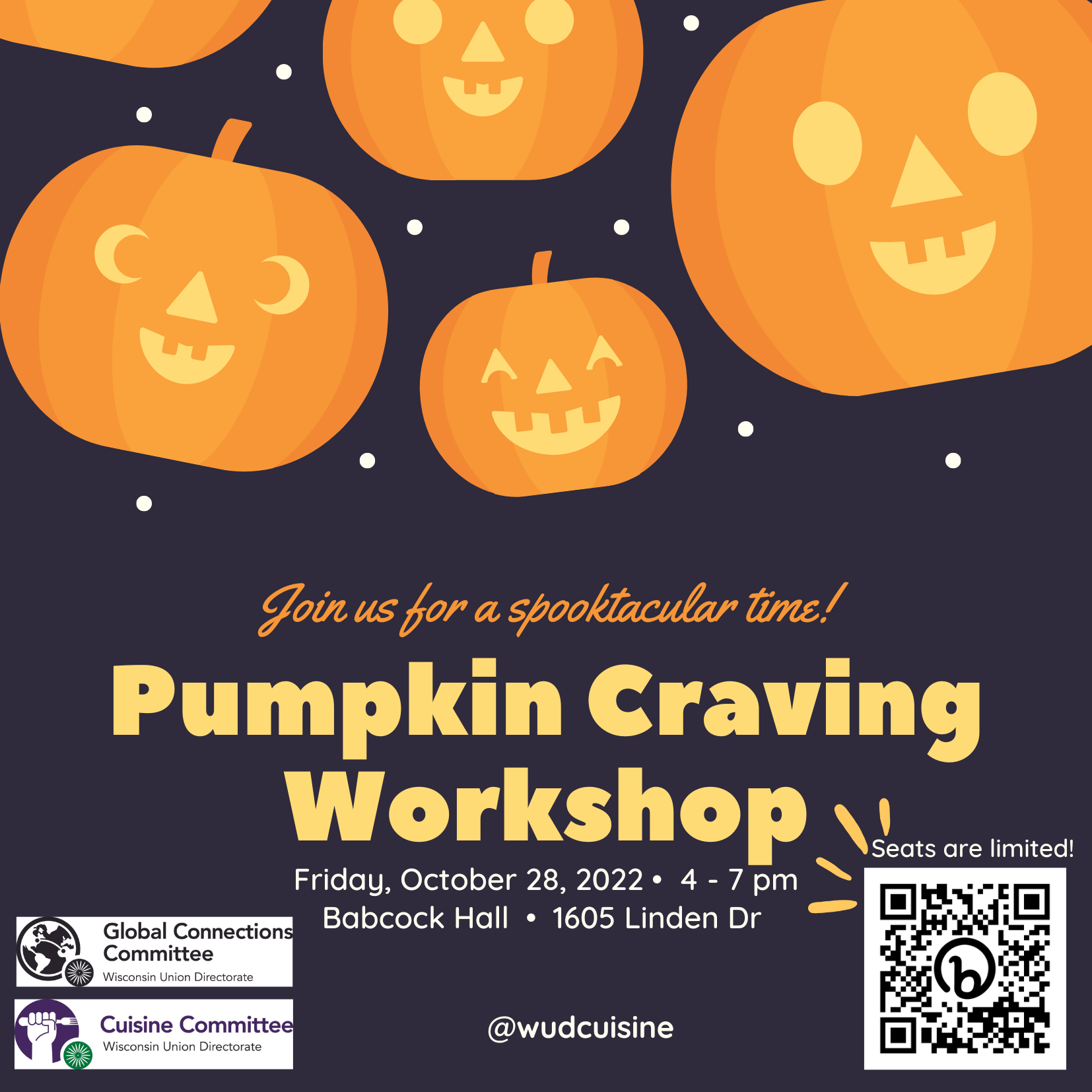 WUD Cuisine and WUD Global Connection Committee will hold a Pumpkin Craving workshop on Friday, October 28, 2022, from 4-7 pm in Babcock hall! Babcock hall is 5-7 minutes by walking from the Union South. Before the event starts, we will post the video of how to get to the Babcock through the Instagram story (@wudcuisine).