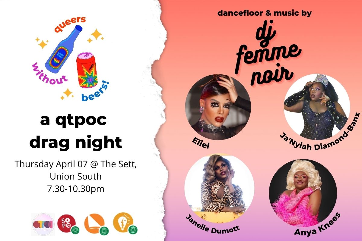 Join us at Queers Without Beers: A QTPOC Drag Night! WUD SoPo, PAC, and DLS in collaboration with QTPOC presents a night of drag appreciation and celebration. The event begins with a set of student performances followed by a set of 4 professional performers from the local Madison drag scene. The event includes appetizers and a dancefloor, with music provided by Madison's very own DJ Femme Noir. Coupons for mocktails from the bar will be provided to the first 150 attendees.