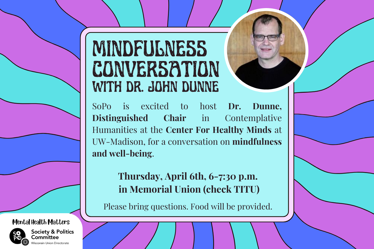 SoPo is excited to welcome Dr. John Dunne, who holds the Distinguished Chair in Contemplative Humanities at the Center For Healthy Minds at UW-Madison and is the department Chair of the Department of Asian Languages & Cultures, for a conversation about mindfulness. Dr. Dunne will present his research on mindfulness and well-being to help you gain awareness and consciousness in your own life.