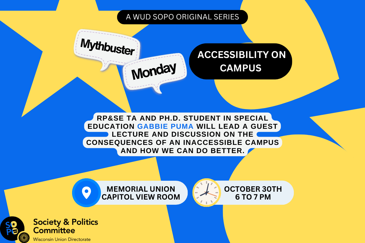 Join WUD SoPo for a Mythbuster Monday discussion with RP&SE TA Gabbie Puma for a discussion about accessibility on the UW campus. Learn about how UW strives to be accessible, what we can do better, and share your unique experience with others. We will meet in Memorial Union's Capitol View (4th Floor) Room on October 30th from 6 to 7 P.M. Please let us know if we can accommodate your participation in this event in any way.