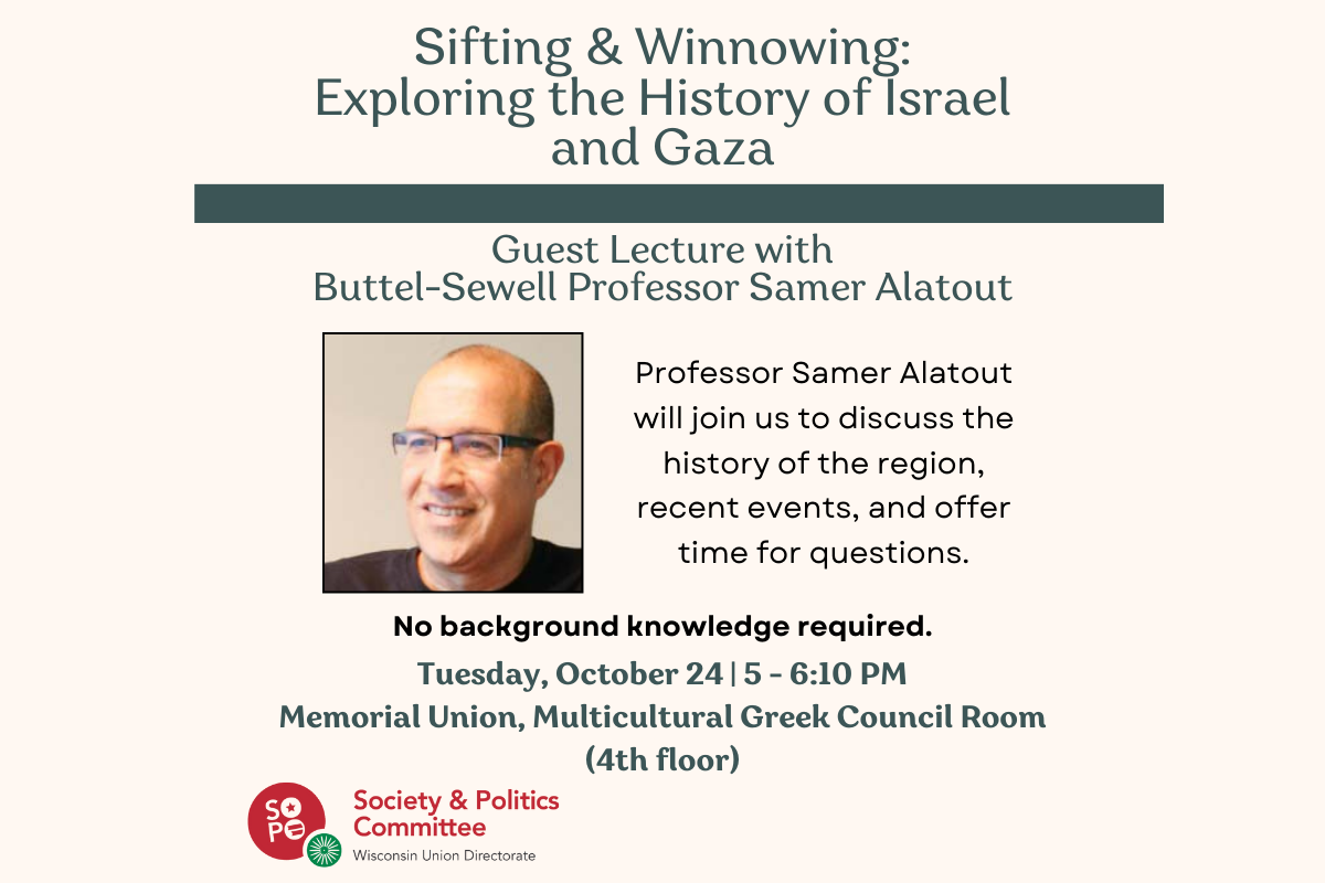Join Wisconsin Union Directorate Society & Politics Committee and guest lecturer Buttel-Sewell Professor Samer Alatout from the Department of Community & Environmental Sociology for Sifting & Winnowing: Examining the History of Israel and Gaza. Professor Alatout, an expert on Israeli-Palestinian politics, will present a historical look at the current conflict in Israel and the Palestinian Territories to help you better understand the news. Whatever your background knowledge, this event is a great opportunity to have your questions answered in a welcoming and respectful environment. This event will be held at Memorial Union's Multicultural Greek Council Room (4th floor) on October 24th from 5 P.M. to 6:10 P.M. Please let us know if we can accommodate your participation in this event in any way.