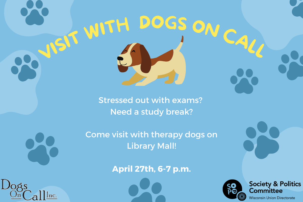 Dogs On Call will be bringing some therapy dogs to make the end of your semester as stress-free as paw-ssible! Come visit them at Library Mall on Thursday, April 27th from 6 to 7 p.m. See you there for a tail-wagging good time!