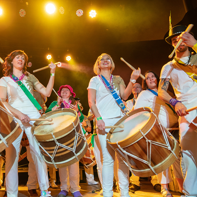 The Handphibians are modeled after the Brazilian baterias (percussion batteries) of the Escolas de Samba in Rio de Janeiro, Blocos Afros of Salvador, and the Maracatu Naçãos of Recife. Their music is also naturally influenced by the percussion traditions of Cuba, Africa, and even good ol' Wisconsin. Founded in 1990s by Robert Schoville, the Handphibians are based in Madison, Wisconsin and are comprised of all voluntary community members of all ages and musical backgrounds.