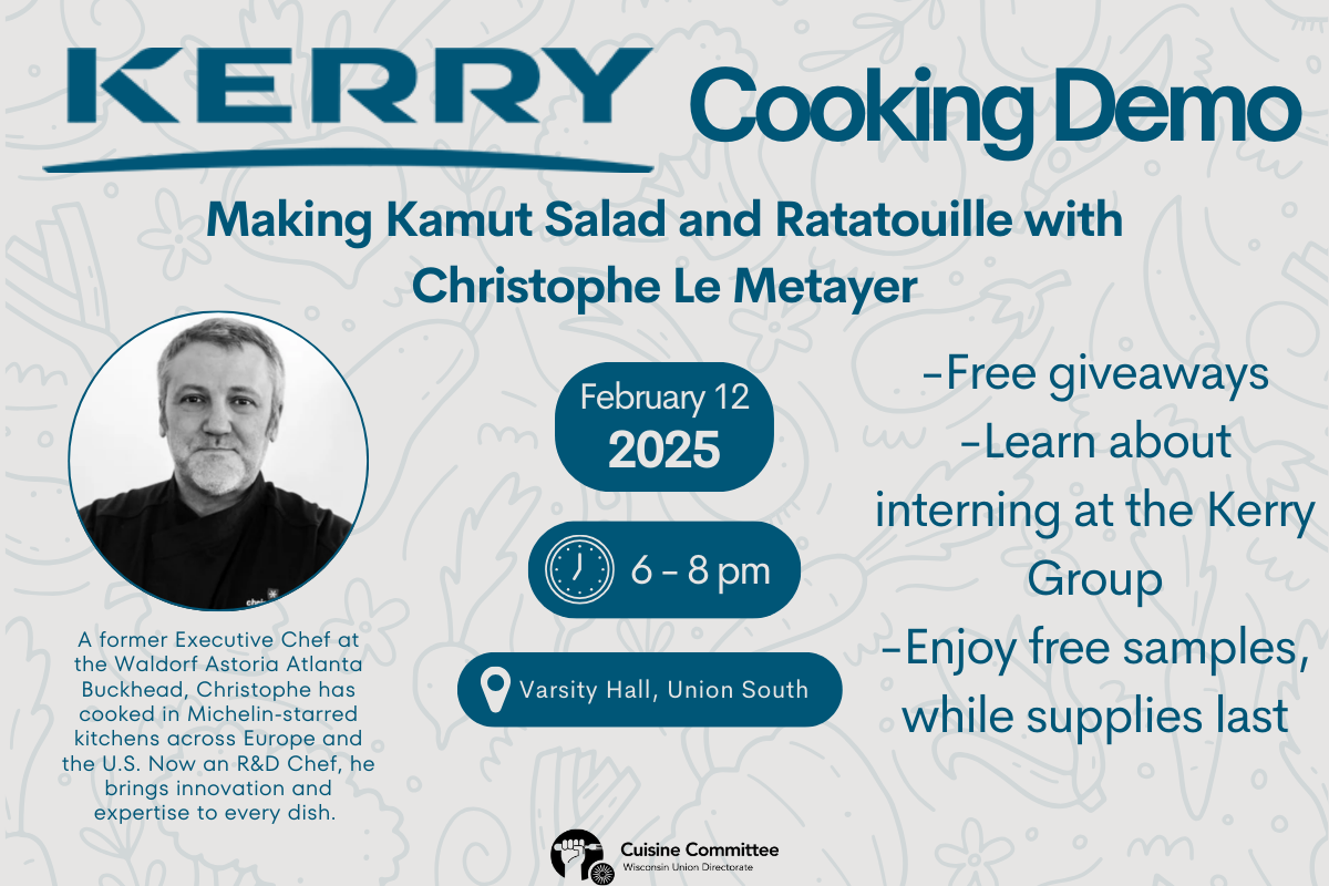 Join WUD Cuisine and the Food Science Club as we welcome Christophe Le Metayer from the Kerry Group for an exciting live cooking demonstration! Discover more about the innovative work of the Kerry Group, explore internship opportunities, and enjoy the chance to win some free giveaways. Enjoy free samples of the Kamut Salad and Ratatouille while supplies last!