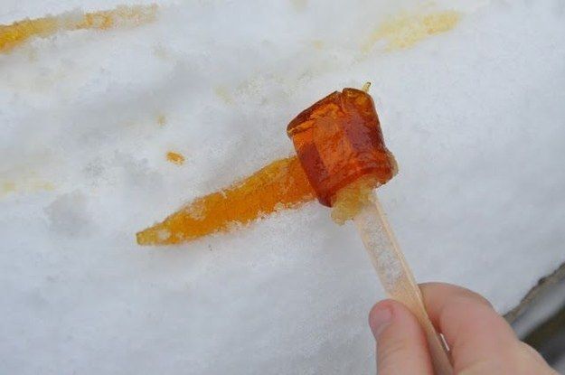 Canadian maple candy is a staple in winter months made by pouring boiling maple syrup past the point where it would form maple syrup on a bed of clean snow and rolling it up on a stick.