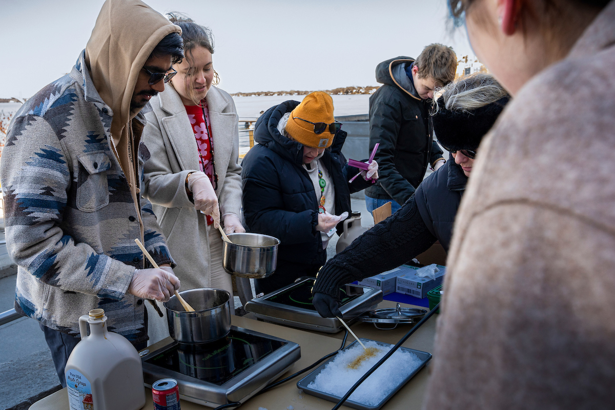 Canadian maple candy is a staple in winter months made by pouring boiling maple syrup past the point where it would form maple syrup on a bed of clean snow and rolling it up on a stick.
