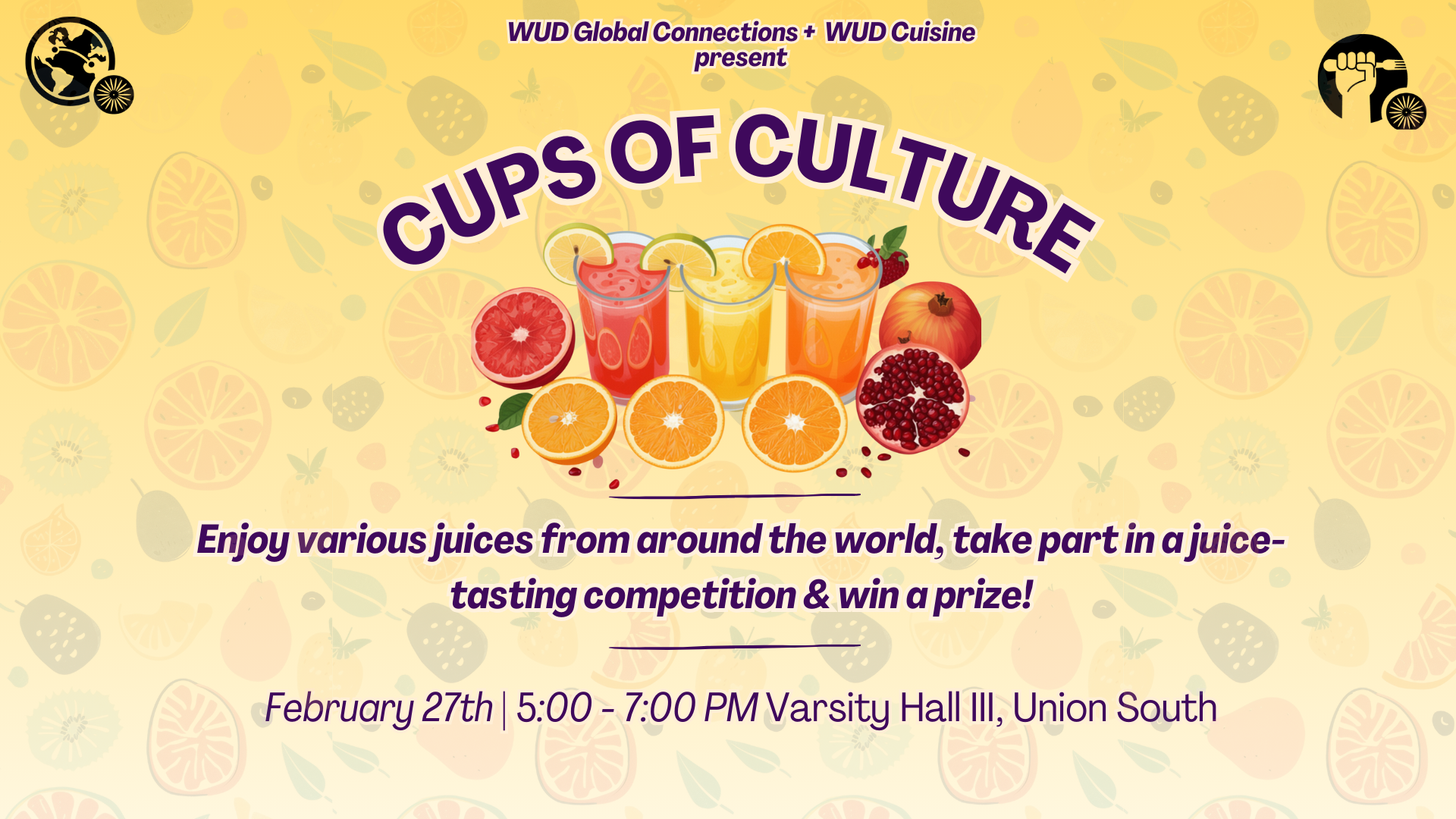 Explore the flavors of the world through a common yet dynamic drink, juice! WUD Global Connections and WUD Cuisine are collaborating for yet another Cups of Culture event! Join us to taste and enjoy juices from around the world, along with some treats on the side. Take part in a juice tasting competition to test your refined palate!