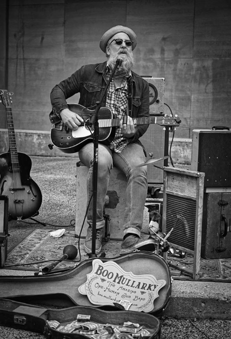 Boo Mullarky is the amazing one-human jug band medicine show, featuring Boo pumping out deep ragtime blues and Cajun tunes on a unique ensemble of old car horns, bells, a half guitar/half bass...guitar, kazoo, an old suitcase for a drum, and a tambourine...all at once! Steeped in the steam of the Gulf Coast marshes, Boo grew up on both sides of the Sabine River, dividing his early world between the lonesome cattle calls of Texas and the high-spirited mournful Cajun wail of Southern Louisiana. With the haunting moan of the swamp and that throbbing Delta backbeat pulse, all peppered up with some fancy finger work and tales of the pavement, Boo colors his songs with a rich homegrown flavor that just can’t be manufactured!