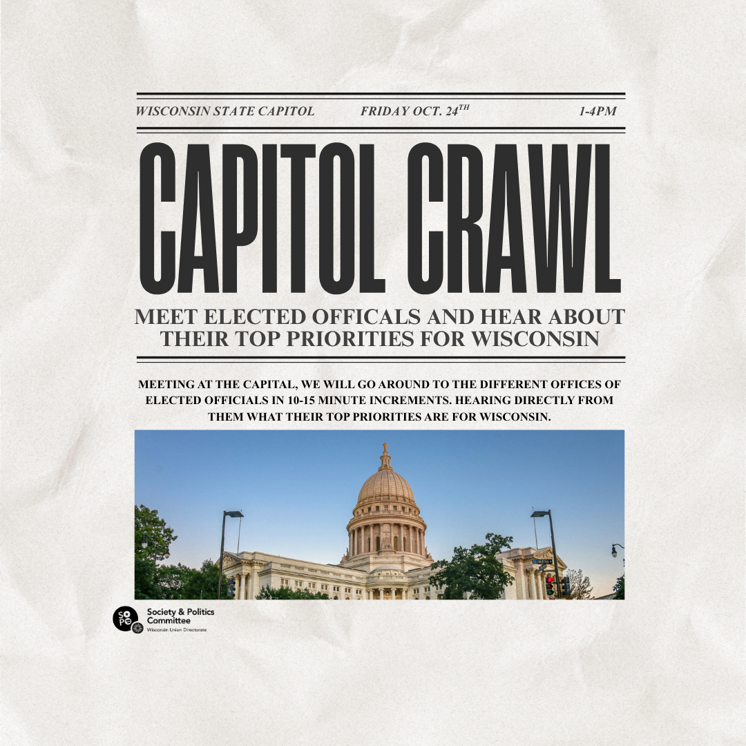 Join WUD Society and Politics in our first ever Capitol Crawl! Meeting at the Wisconsin State Capitol, we will go around to the different offices of elected officials in 10-15 minute increments. Get the chance to meet these elected officials in person, and hear DIRECTLY from legislators about their current and top priorities for Wisconsin.